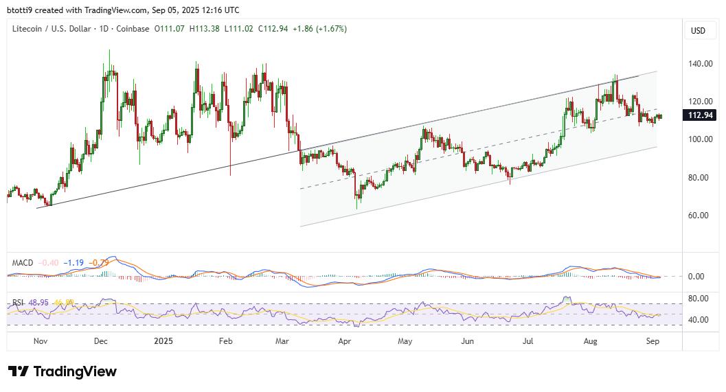 莱特币周五突破 110 美元大关,截至 2025 年 9 月 5 日,交易价格接近 113 美元。