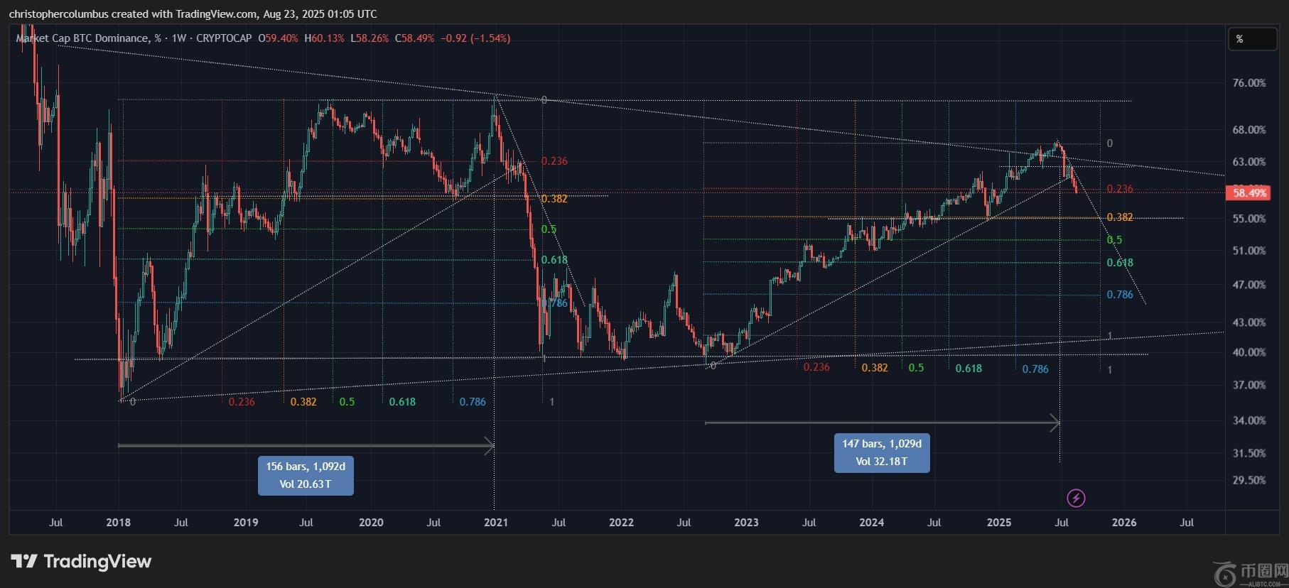 Dave The Wave 还强调,比特币主导地位(BTC.D)——追踪比特币在加密货币市值中所占比例——将继续下跌,为奠定基础繁荣,与上一个周期非常相似。