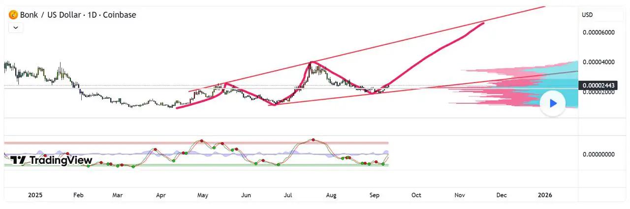 Bonk (BONK) 价格大幅上涨。过去几天价格下跌后,价格出现反弹,交易量也随之扩大。目前价格约为 0.00002486 美元,使其成为目前较为活跃的 meme 代币之一。