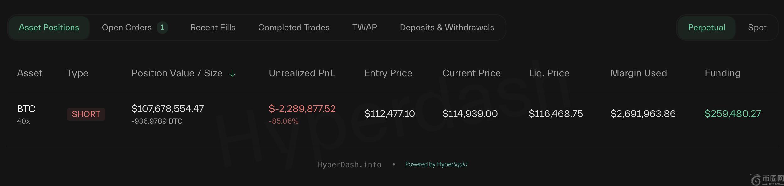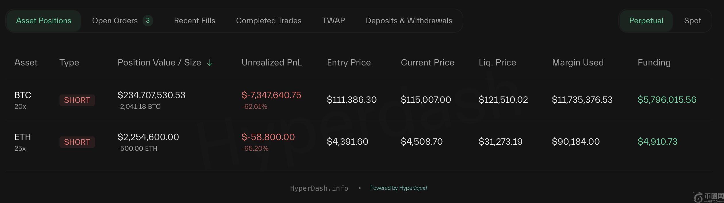 根据 超级冲刺 的最新数据,他目前的 BTC 空头也处于亏损状态,未实现损失总计约 228 万美元。