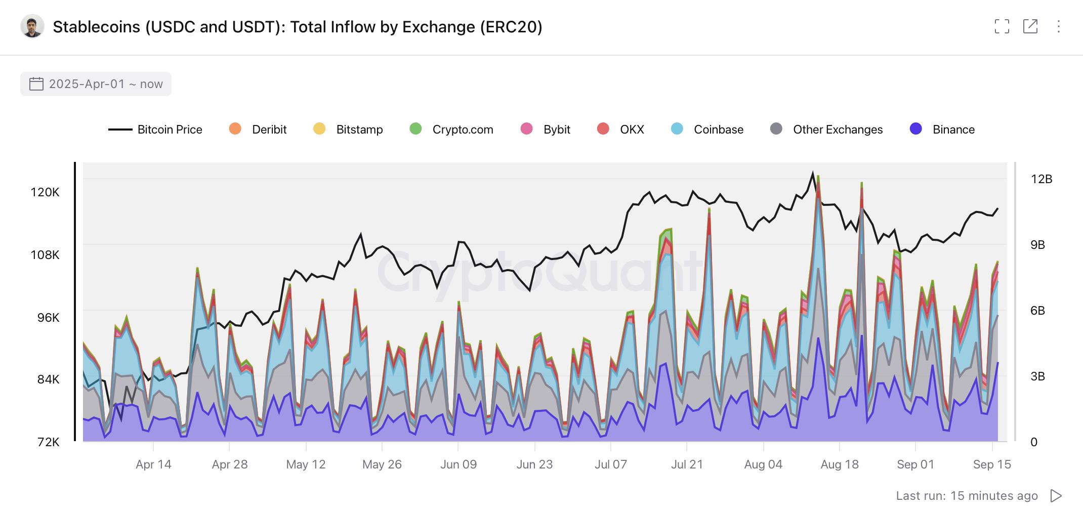 Cryptoquant 研究主管,胡里奥·莫雷诺表示,这一增幅表明,在交易员等待声明的同时,资金被存放在中心化场所,杰罗姆·鲍威尔新闻发布会。这不仅仅是更多的稳定币——而是更大的票。