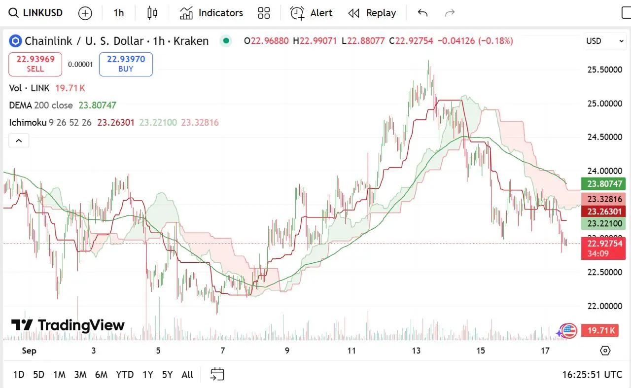 Chainlink 的交易价格为 22.90 美元,过去 24 小时内下跌 1.84%。尽管价格有所下跌,但其 155.4 亿美元的市值和 7.9723 亿美元的 24 小时交易量(上涨 17.33%)反映出市场对其预言机服务的强劲需求。随着越来越多的DeFi