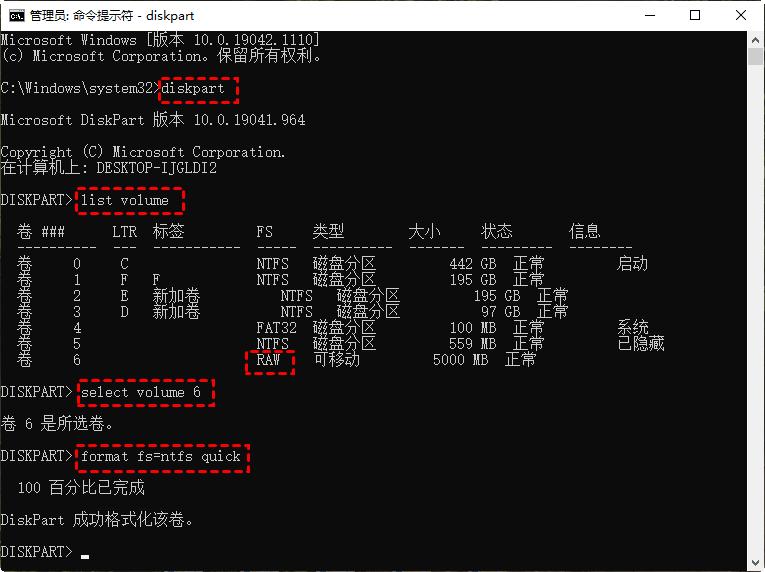 select volume 6(将6替换为您要格式化的设备的卷号)