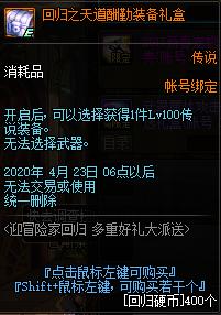 回归之天道酬勤装备礼盒开启后,可以选择获得1件LV100传说装备,无法选择武器。