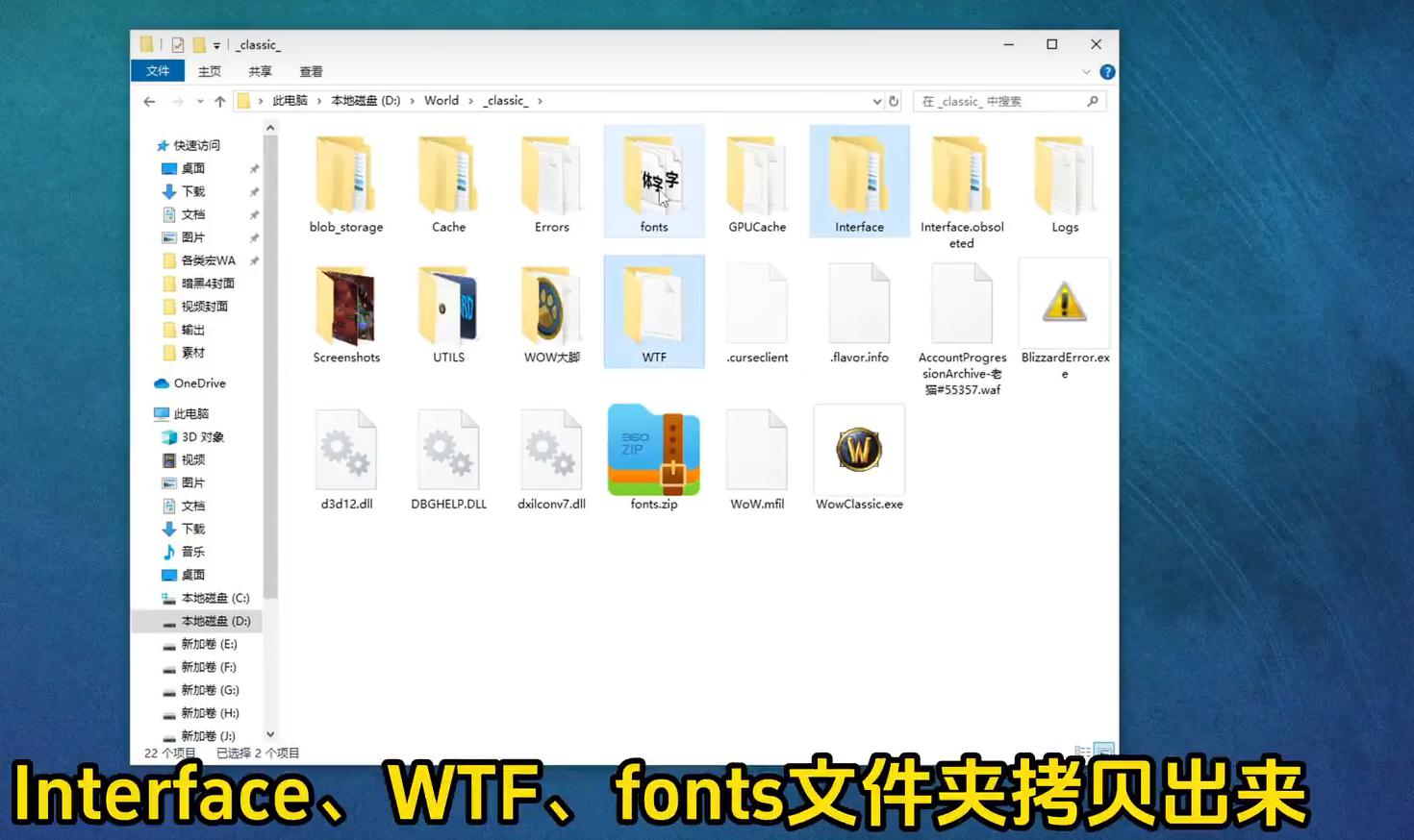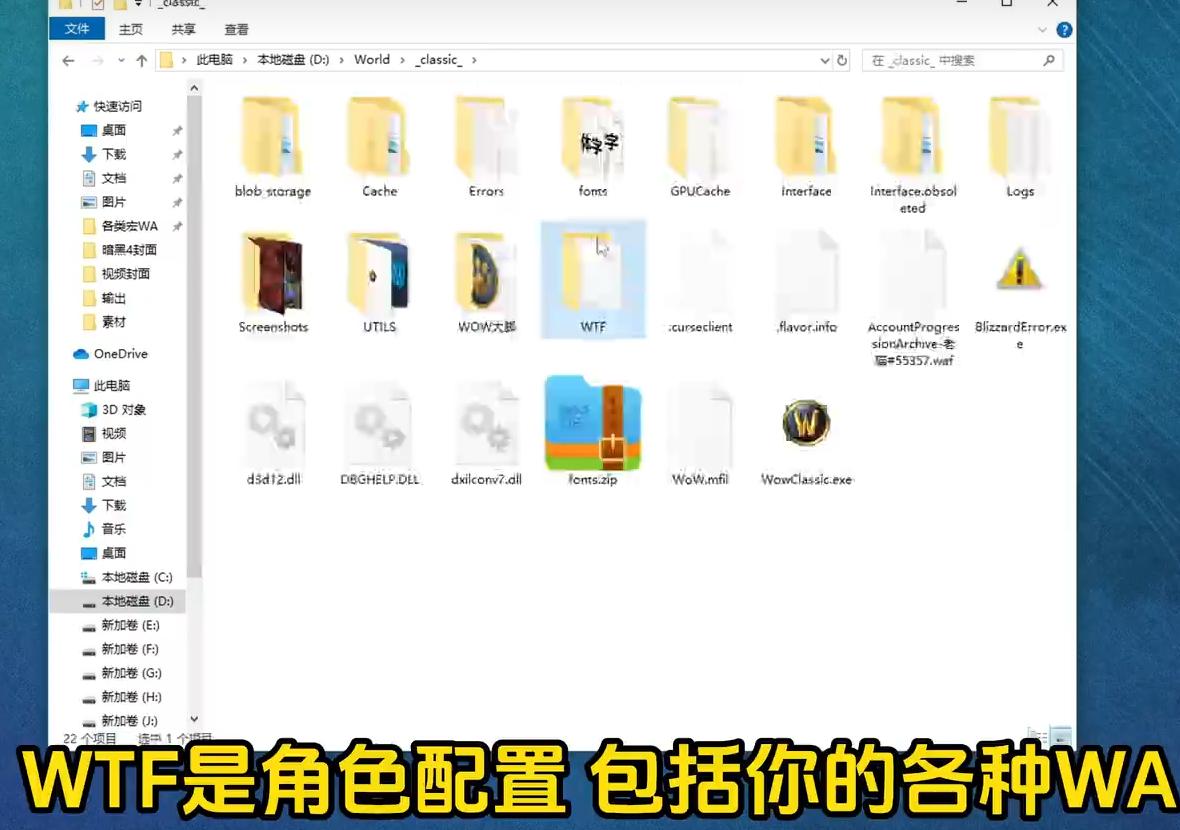 但在删除前,您可以将“interface”和“WTF”文件夹(INTERFACE对应插件包,WTF对应角色配置)拷贝出来。若您使用了自定义字体,则可能还有“Fonts”文件夹(字体文件夹)。