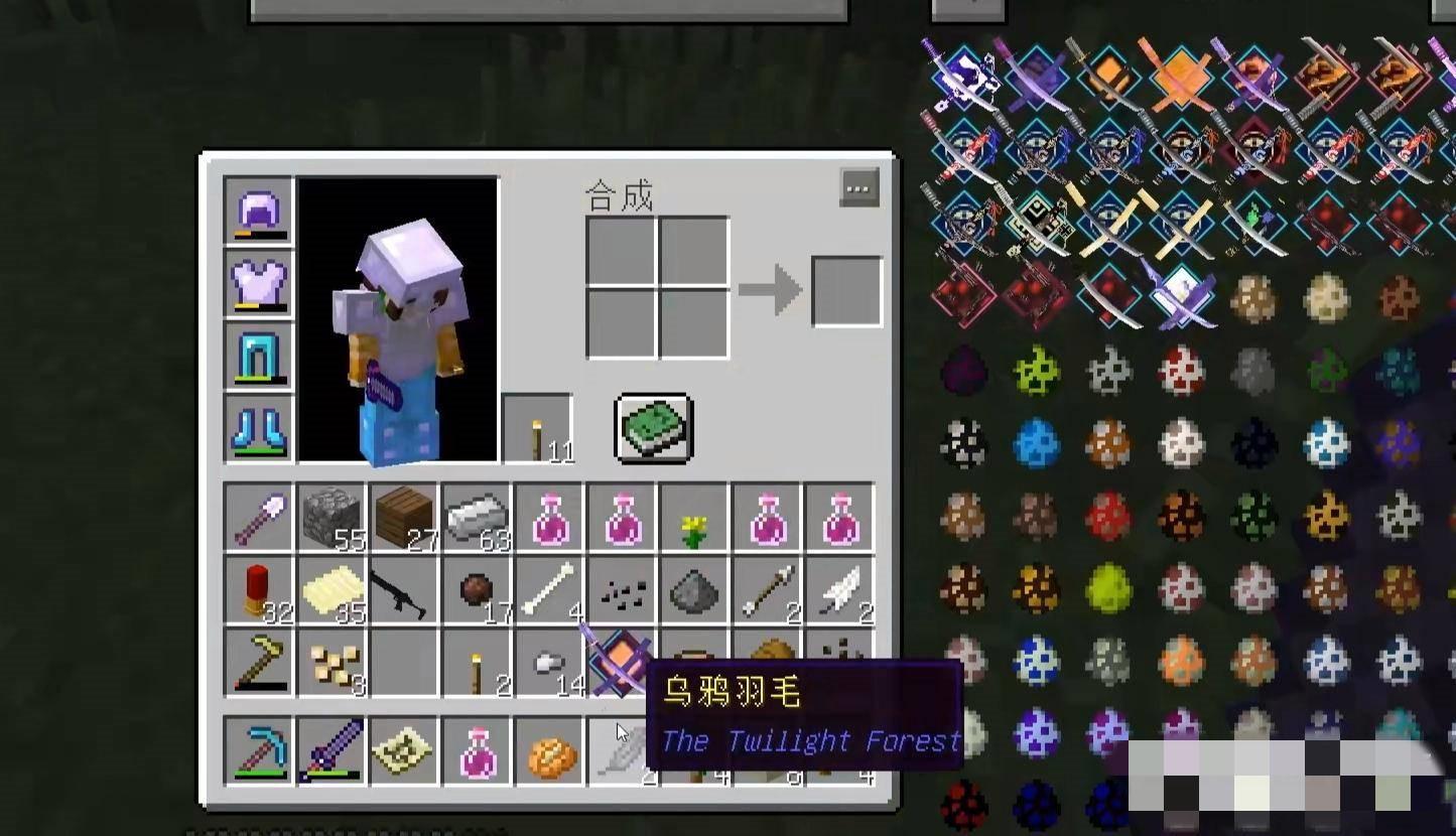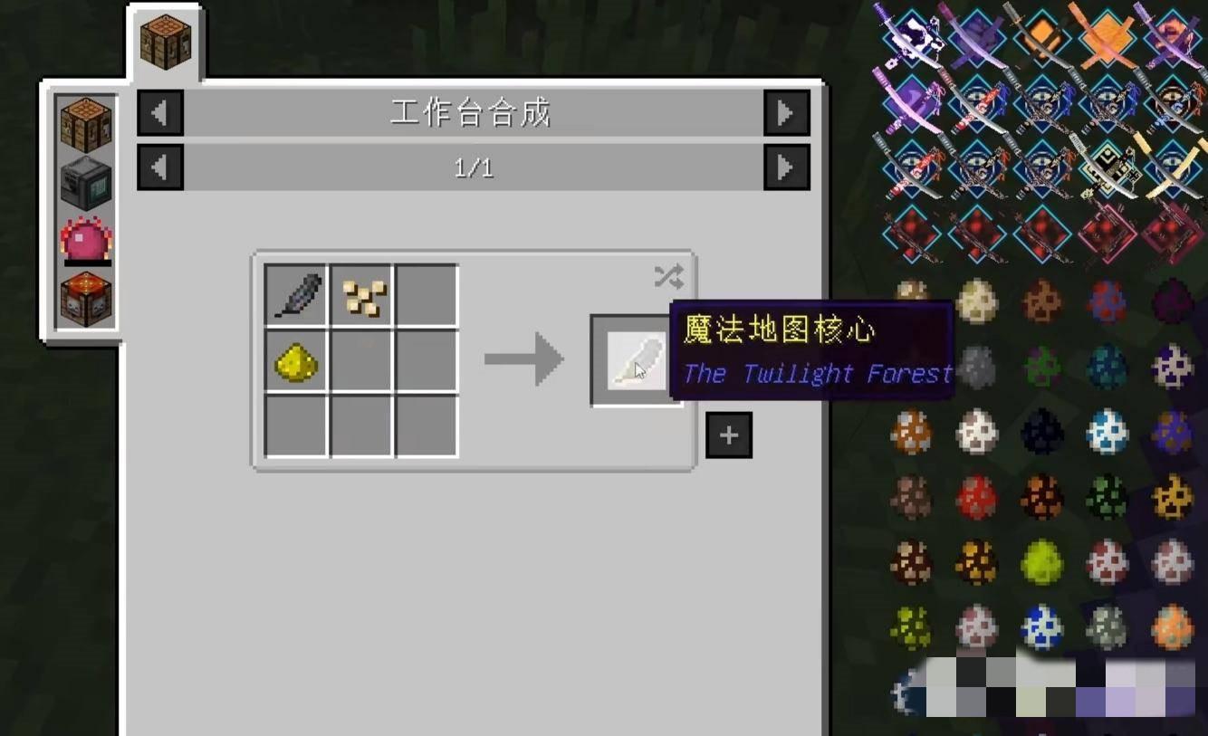 1、准备好乌鸦毛、火炬浆果和萤石粉制作魔法地图核心。