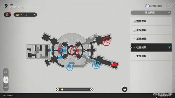 收容舱段(红色是一楼,蓝色是二楼,搭乘地图中间的电梯可以快速移动)