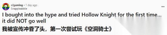 “Snappleabble”说道:“受《空洞骑士:丝之歌》的影响,我决定尝试《空洞骑士》。平时我玩挑战性游戏还算顺手,例如通关过《黑暗之魂3》,还轻松打过了《艾尔登法环》的一半内容,虽然不偏爱高难度游戏,但至少不会比别人表现得更挣扎。”