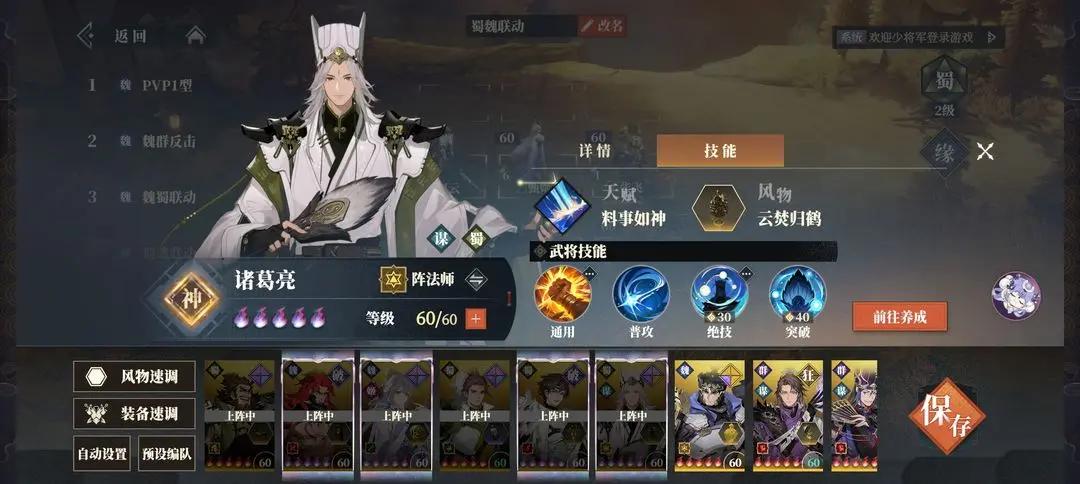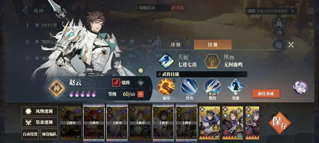三国志幻想大陆2枭之歌蜀国阵容怎么玩?这次给大家推荐一套蜀魏联动队,之前发的配队里都已经有赵云和刘备了而诸葛亮也能打反击我就索性以蜀国为主搞了这么个配队。这个配队特别在能打输出的足足有4个!赵云主c堆最高攻击,典韦副c堆第二高攻击,诸葛亮功能c堆第三高攻击,张飞逆境c有什么用什么。接下来我给说说详细定位