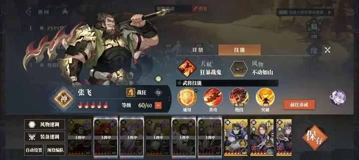 4、张飞:逆境c,前期负责挨打和回能工具人,由于技能原因通常血量是全队最低的,也就是说是被挂反击buff的常驻人选。张飞天赋和战狂职业配合风物不动如山只要挨打就能提高攻击,在有反击buff的情况下哪怕前期只是当回能工具人也能有不俗的输出能力(尤其是配合典韦一起精准反击对面输出)。到了后期攻击叠起来后会反超一众输出成为最高,也就是说会被优先被对手集火变相保住了其他输出。那时候张飞功攻高防高不带怕的,有能量的话一个大招巨疼还能把血吸满。