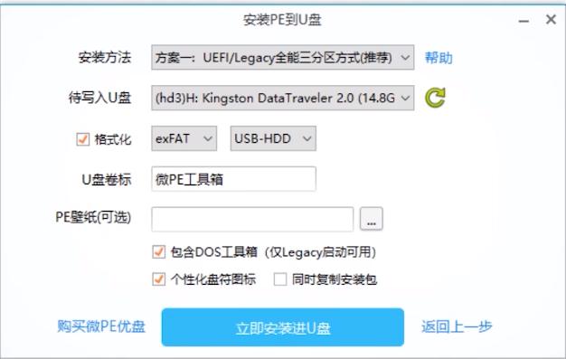 4、其中的"安装方法"选择默认;"待写入U盘"选择我们需要安装PE的U盘;"格式化"默认即可;"U盘卷标"就是命名你的U盘的名称,默认为"微PE工具箱";将"包含DOS工具箱"以及"个性化盘符图标"小方框勾选上,点击"立即安装进U盘"按钮。