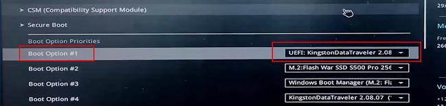 10、接着点击"Boot Option #1"右侧的选项框下拉按钮,选择对应的系统U盘"UEFI",然后按下F10保存并重启。