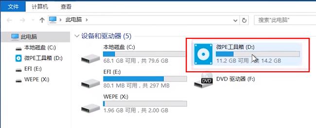 6、这时打开桌面上的"我的电脑"就会发现U盘被分成了两个分区,其中的"EFI分区"就是放入PE的分区,不要在其中放入或更改文件;另一个是空白分区,可以将其当做普通分区来使用。
