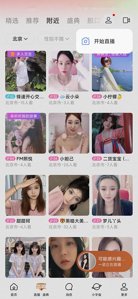 1、登录陌陌账号后,点击直播界面右上角的摄像头图标,选择【开始直播】。