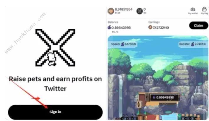 2.推特内点开图标后,选“Sign in”进入,关联推特,授权应用程序,授权后页面会跳转,这时候需要输入邀请码才能进入游戏,邀请码:xpet_91362553用它进游双方都有加成(官方默认没有)