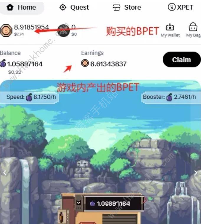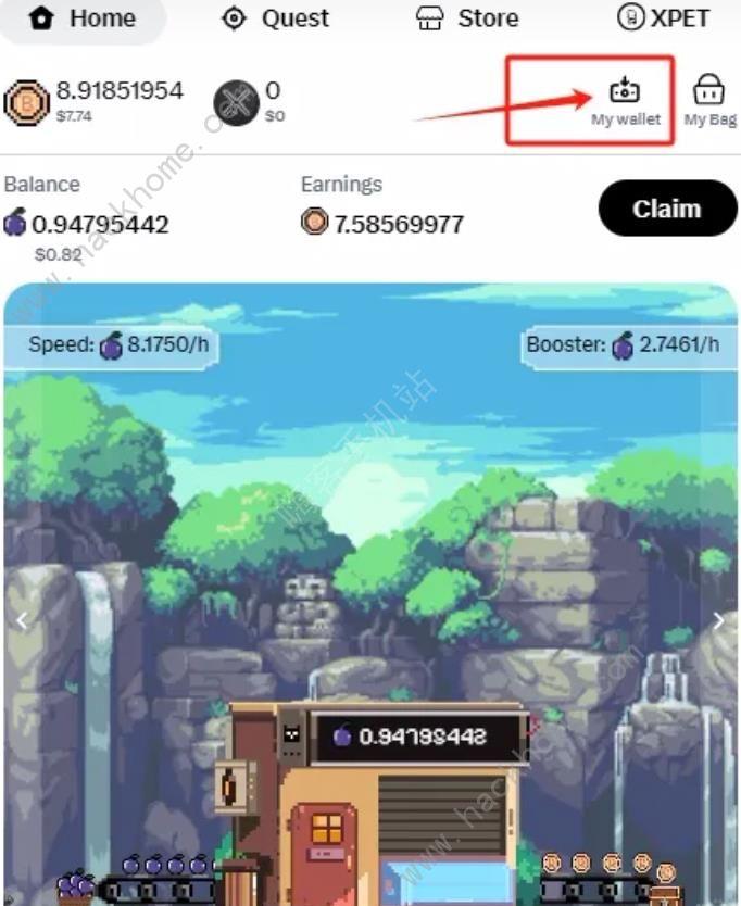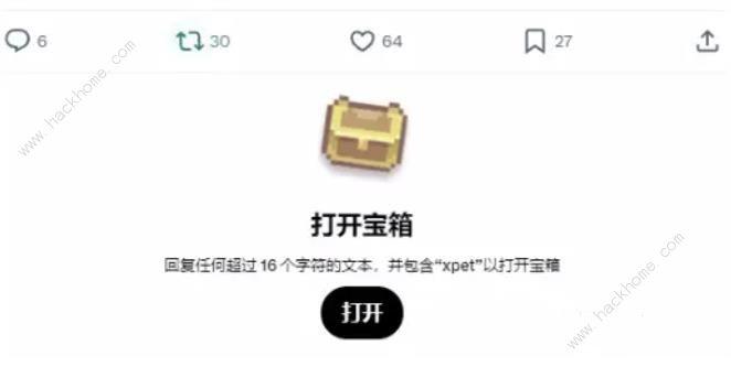 *下载游戏后刷推特会在用户头像下方看见箱子,点开箱子然后就地留言16个字符+“XPET”可以打开,打开后获得食物和金币。一天两次。