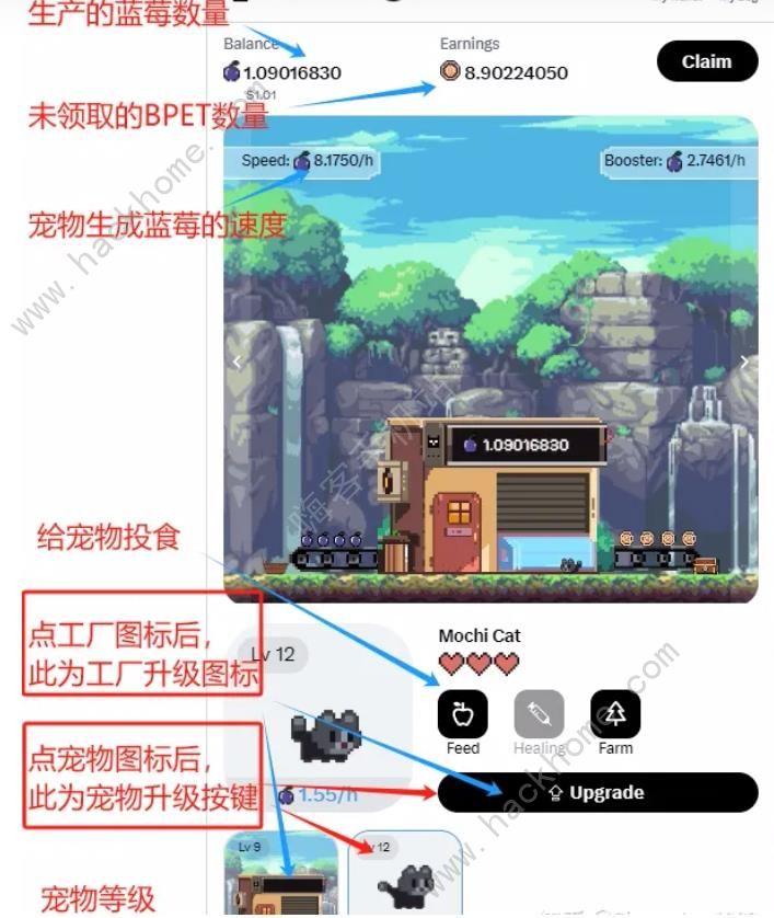 6.游戏玩法攻略和避坑8关键点:*小猫升级到7级可以开始挖蓝莓,升到10级开启工厂可以把蓝莓转化成BPET提现。