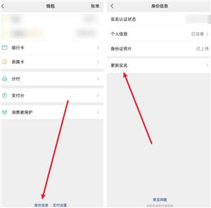 2.进入钱包后我们能看到底部有“身份信息”和“支付信息”两个选项,我们点击【身份信息】,然后就能看到【更新实名】的入口;