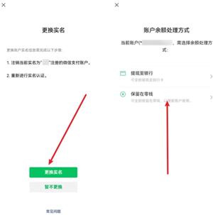3.进入下一步后就会提示更换实名的话会先注销微信支付,如果确认无误我们再点击底部的【更换实名】,接着需要选择将余额提现或者存放的零钱,才可以完成微信支付的注销;