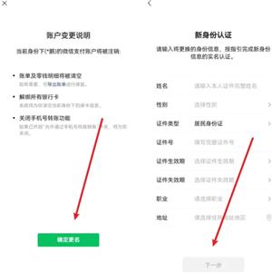 4.最后阅读完“账户变更说明”后再点击【确定更名】,然后根据提示完成验证后,再输“新身份认证”的信息后点击底部的【下一步】即可完成实名的更好。