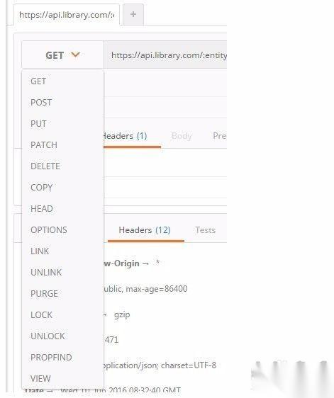 点击’Headers’按钮,Postman同样会弹出一个键值编辑器。在这里,你可以随意添加你想要的Header attribute,同样Postman为我们通过了很贴心的auto-complete功能,敲入一个字母,你可以从下拉菜单里选择你想要的标准atrribute。如下图所示