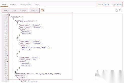 【举例:response】在第6步后,点击了Send之后,可以在Postman上直接看到response的内容,内容很漂亮,Postman根据内容检索自动按JSON的格式显示出来,同时我们可以清楚的看到status code和花费的时间。如下图所示就是我们看到的response