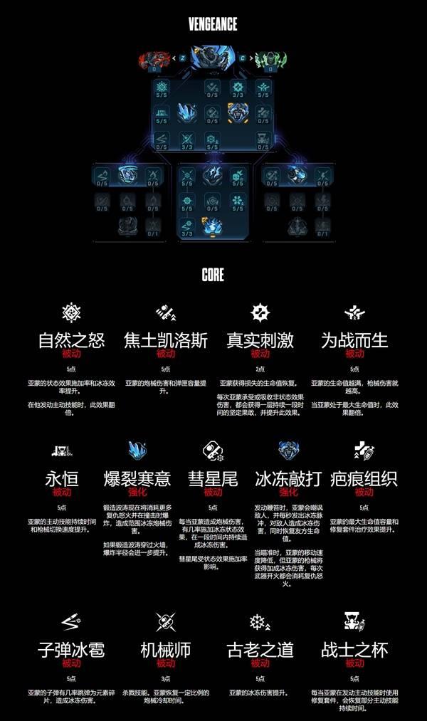 ·鞭笞(复仇怒火技能树):亚蒙装备锻造盾牌吸收所有正面伤害,并转化为复仇怒火。当复仇怒火条全满时,锻造盾牌则会提供伤害减免。如一段时间内未获得复仇怒火,其会迅速消耗。按下主动技能发射锻造波涛,对穿过的敌人造成冰冻炮械伤害,并会消耗复仇怒火提升造成的伤害。