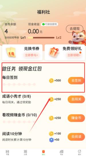 1、在甜瓜小说APP中,领取福利金币的方式多样,用户可以通过每日签到积累金币。