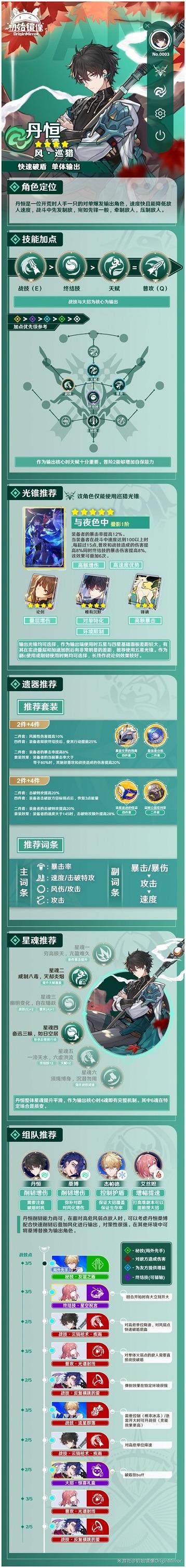 角色一图流内容包括:角色定位、技能加点优先级、光锥推荐、遗器推荐、星魂推荐和组队推荐,认真看完一图流,大家就可以对丹恒的玩法有一个大致思路啦。
