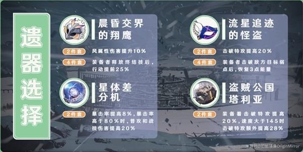 丹恒的第二种遗器选择为【流星追迹的怪盗】四件套加【盗贼公国塔利亚】二件套,两个套装都对击破特攻有高额加成,可以大幅提升丹恒的压制能力,而且对击破弱点后的瞬间伤害和持续伤害也有较高加成。