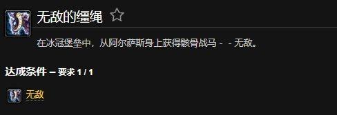 成就系统作为魔兽世界的一种玩法,相信有不少小伙伴有收集成就的爱好,那么小伙伴想知道如何完成无敌的缰绳这个成就,完成方法需要在冰冠堡垒中,从阿尔萨斯身上获得骸骨战马--无敌就能获得。