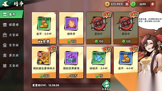1、集市:优先购买5折以下的豪侠令、英雄令,5折突破丹、6折无字天书,以及所有可用金币购买的道具。