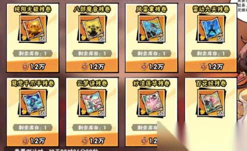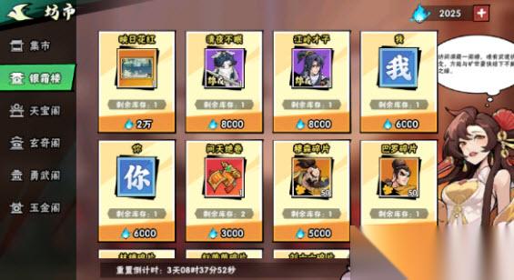 2、银霜楼:每周购买两个红色秘籍卷轴,资源充足时可购买皮肤和“字”。